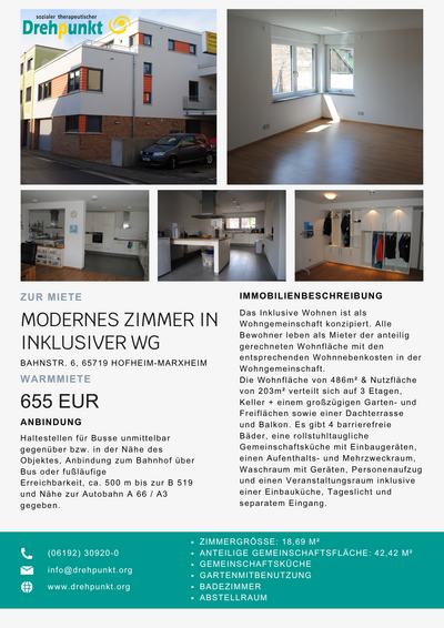 In unserer inklusiven Wohngemeinschaft in Hofheim-Marxheim wird zum 1. Dezember 2025 ein Zimmer frei. Bei uns leben Menschen mit und ohne Beeinträchtigung gleichberechtigt zusammen, gestalten ihren Alltag gemeinsam und unterstützen sich gegenseitig – so viel wie jeder möchte und kann. Das Haus ist barrierefrei, modern ausgestattet und bietet sowohl Gemeinschaft als auch Rückzugsmöglichkeiten.